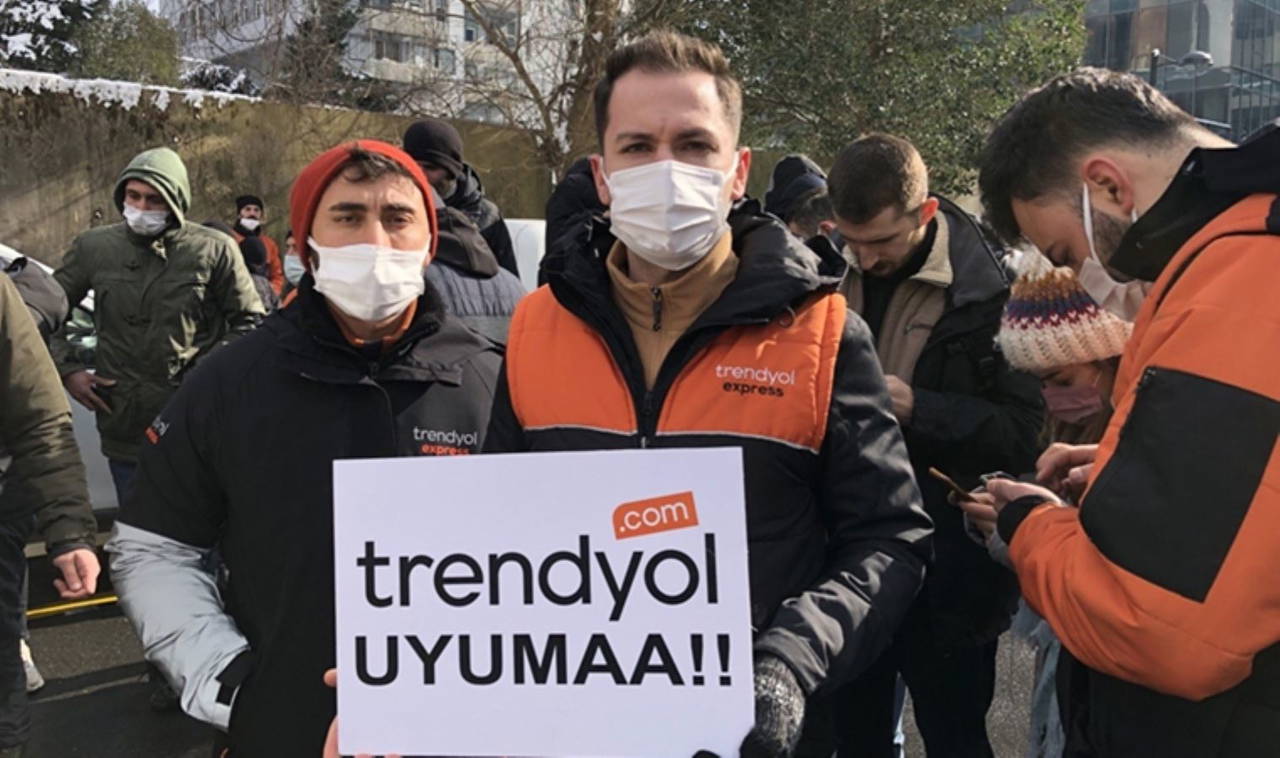 Türkiye'nin en büyük online alışveriş sitelerinden biri olan Trendyol'da 'esnaf kurye' sistemiyle çalışan işçiler, kötü çalışma koşulları ve düşük ücretlere karşı başlattıkları eylemlerini bugün şirketin önüne taşıdı.