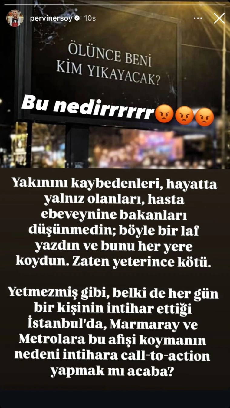 Ayşe Arman afişleri yayınlayıp "Maskeli ya da maskesiz depresyon yaşıyoruz. Kaygı, endişe hat safhada. Şiddet vakaları, intihar haberleri artıyor, her gün birileri kalpten, kanserden, ondan budan, patır patır gidiyor. Canımız burnumuzda. Ekonomik krizle baş edemiyoruz. Önümüzü göremiyoruz. Toplum olarak, feci halde sıkışmış haldeyiz. Ve şehrin (hatta pek çok şehrin) her yerindeki billboardlarda, ‘Ölünce beni kim yıkayacak?’ yazıyor. Bunu, dahiyane bir reklam sloganı gibi görenlerde, empati gerçekten sıfır" ifadelerini kullandı.