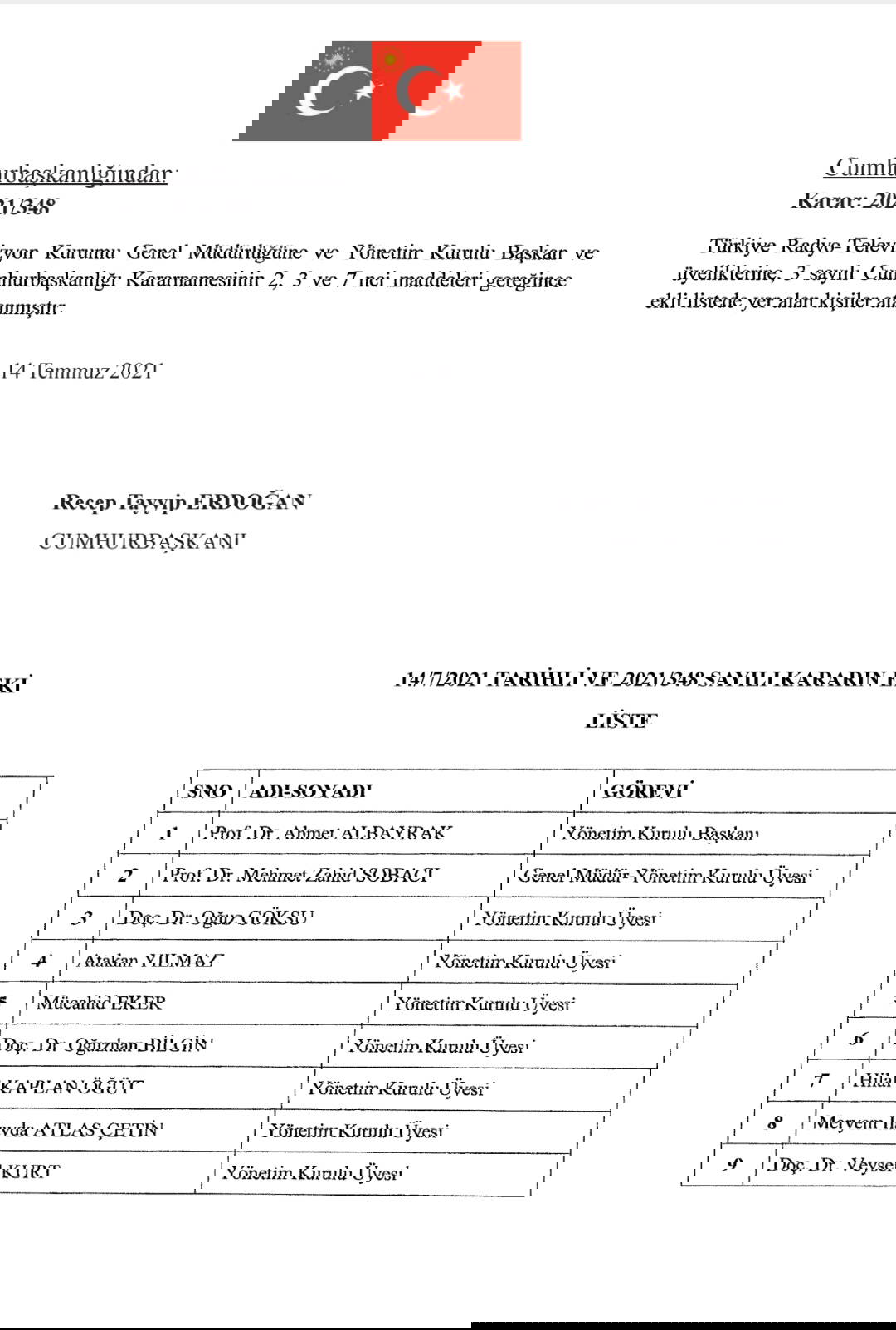 Mükerrer sayıda yer alan kararla TRT Yönetim Kurulu üyelerinin ataması da yapıldı. Cumhurbaşkanı Erdoğan tarafından atanan TRT’nin yeni Yönetim Kurulu şu isimlerden oluştu:
