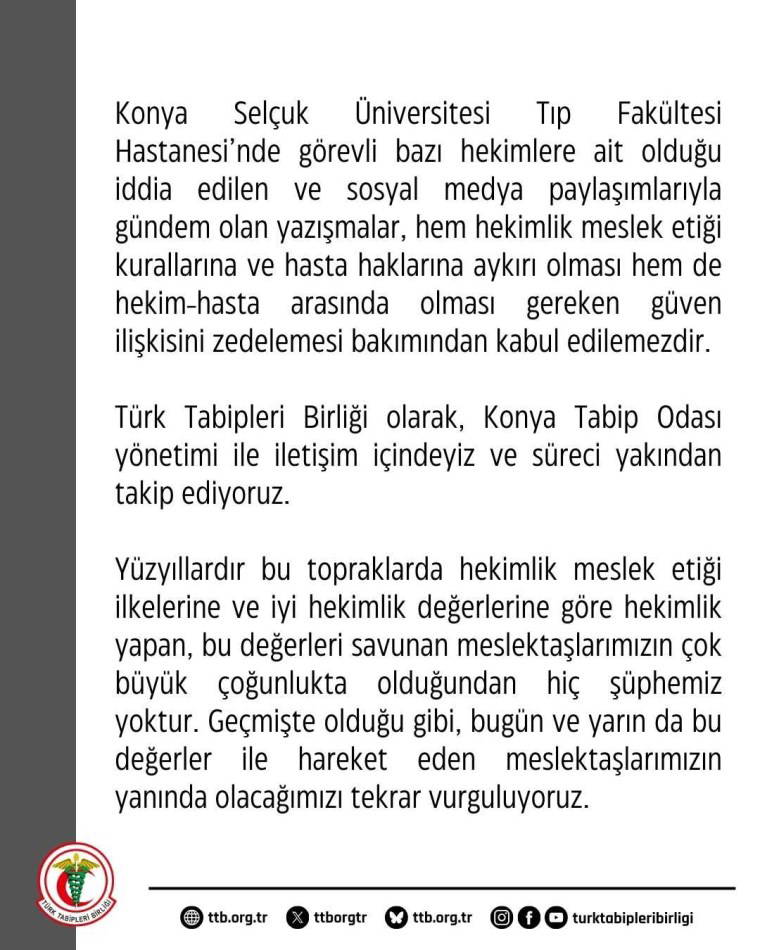 "Konya Selçuk Üniversitesi Tıp Fakültesi Hastanesi’nde görevli bazı hekimlere ait olduğu iddia edilen ve sosyal medya paylaşımlarıyla gündem olan yazışmalar, hem hekimlik meslek etiği kurallarına ve hasta haklarına aykırı olması hem de hekim-hasta arasında olması gereken güven ilişkisini zedelemesi bakımından kabul edilemezdir.