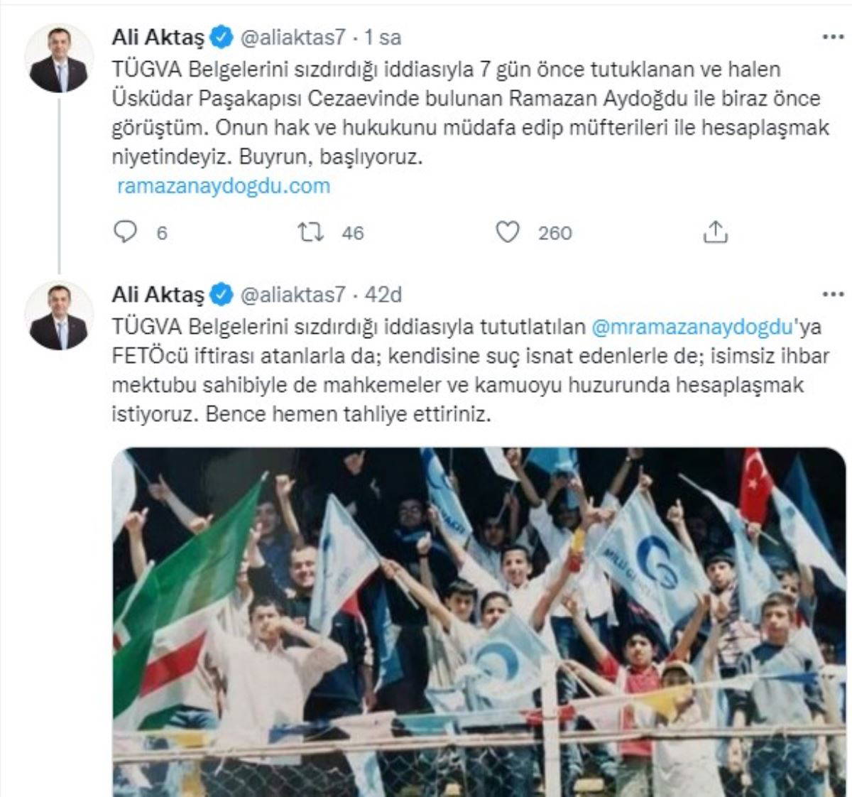 "TÜGVA belgelerini sızdırdığı iddiasıyla Ramazan Aydoğdu'ya FETÖ'cü iftirası atanlarla da; kendisine suç isnat edenlerle de; isimsiz ihbar mektubu sahibiyle de mahkemeler ve kamuoyu huzurunda hesaplaşmak istiyoruz. Bence hemen tahliye ettiriniz" diyen Ali Aktaş, Türk Ceza Kanunu'nun 135. maddesine atıf yaparak şunları belirtti: