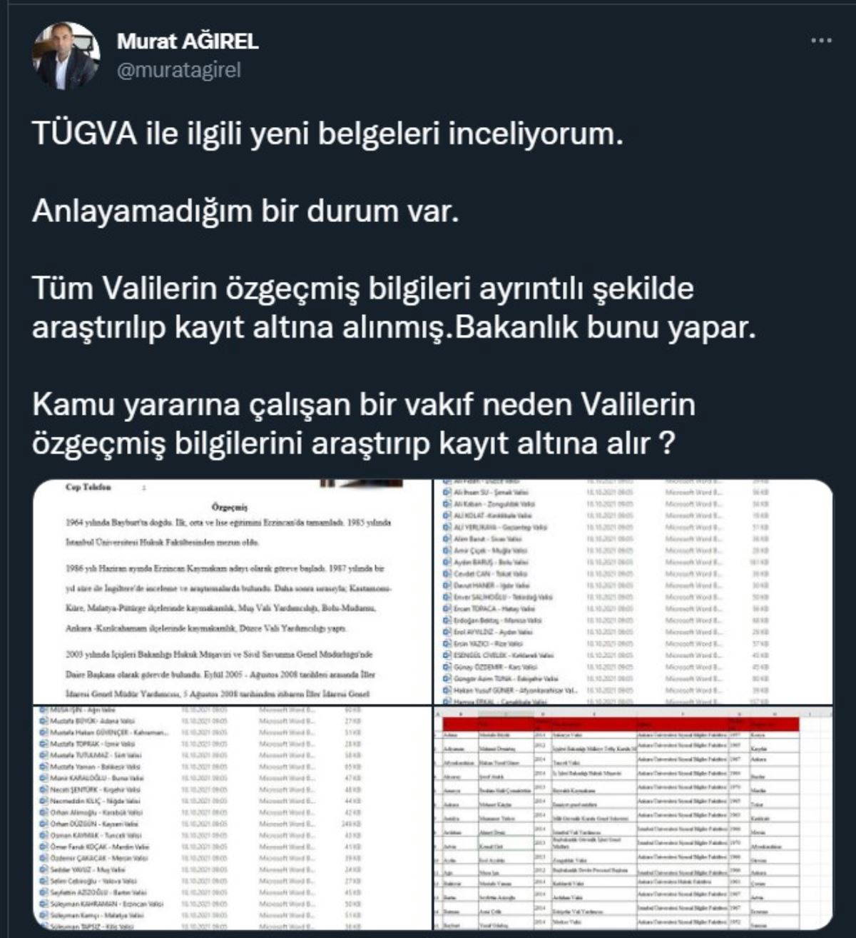 Sosyal medyadan bilgileri paylaşan Ağırel, "TÜGVA ile ilgili yeni belgeleri inceliyorum. Anlayamadığım bir durum var. Tüm Valilerin özgeçmiş bilgileri ayrıntılı şekilde araştırılıp kayıt altına alınmış. Bakanlık bunu yapar. Kamu yararına çalışan bir vakıf neden Valilerin özgeçmiş bilgilerini araştırıp kayıt altına alır?" dedi.