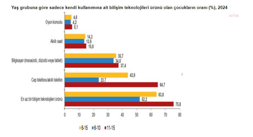 Bilgisayar (masaüstü/dizüstü/tablet), cep telefonu/akıllı telefon, akıllı saat ve oyun konsolu teknoloji ürünlerinden en az birinin sadece kendi kullanımında olduğunu beyan eden çocukların oranı, 2024 yılında yüzde 63,8 oldu. Bu oranın erkek çocuklarında yüzde 66,9, kız çocuklarında yüzde 60,5 olduğu görüldü. Sadece kendi kullanımında bir bilişim teknoloji ürünü olan çocuklar yaş gruplarına göre incelendiğinde, en belirgin farkın cep telefonu/akıllı telefon kullanan çocuklarda olduğu görüldü.