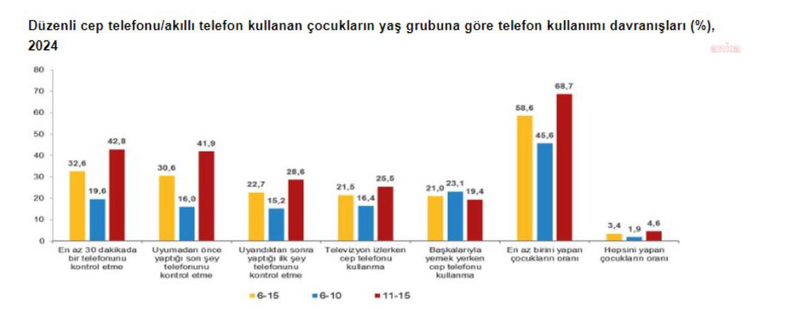 Düzenli cep telefonu/akıllı telefon kullanıp en az 30 dakikada bir telefonunu kontrol eden, uyumadan önce en son ve uyandıktan sonra ilk yaptığı şey telefonunu kontrol etmek olan, televizyon izlerken ve başkalarıyla yemek yerken dahi telefon kullanan çocukların oranı yüzde 3,4 iken bunlardan en az birini yapan çocukların oranı yüzde 58,6 oldu. Bu davranışlardan en az birini gerçekleştiren çocukların oranı 2021 yılında yüzde 52,4'tü.