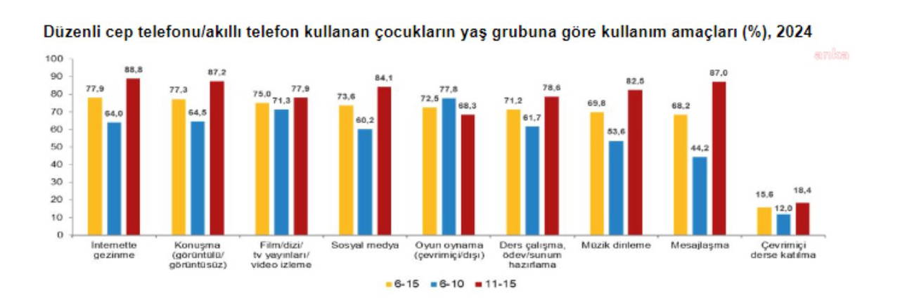 Cep telefonu/akıllı telefon kullandığını belirten çocukların oranı, 2024 yılında yüzde 76,1 oldu. Cep telefonu/akıllı telefon kullanma oranı yaş gruplarına göre incelendiğinde ise bu oranın 6-10 yaş grubundaki çocuklarda yüzde 66,3, 11-15 yaş grubundaki çocuklarda ise yüzde 86,2 olduğu görüldü.