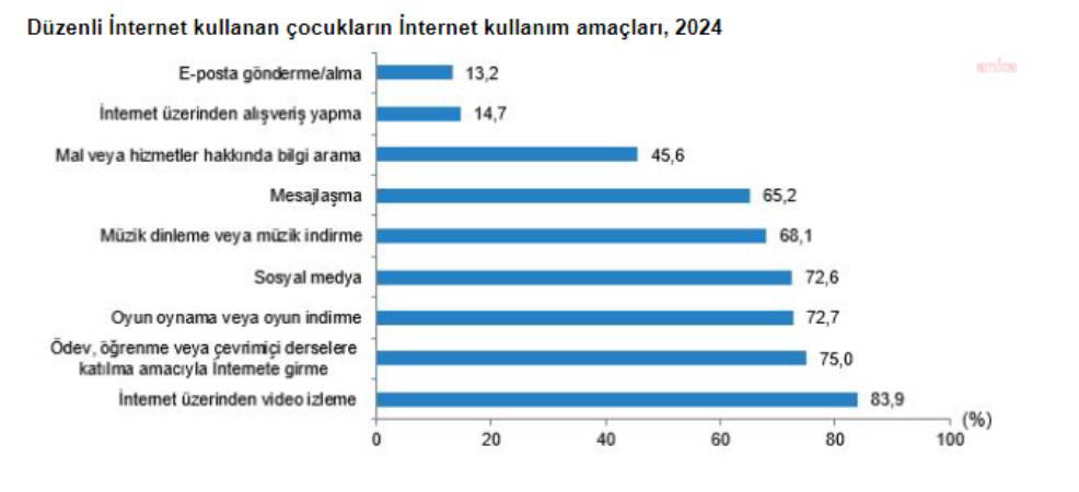 Düzenli internet kullanan çocukların internet kullanım amaçları incelendiğinde; en fazla yürüttükleri faaliyetler sırasıyla yüzde 83,9 ile video izleme, yüzde 75 ile ödev, öğrenme veya çevrimiçi derslere katılma ve yüzde 72,7 ile oyun oynama veya oyun indirme oldu. Çocukların internette en az yürüttüğü faaliyet ise yüzde 13,2 ile e-posta gönderme veya alma oldu.