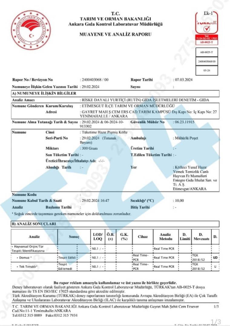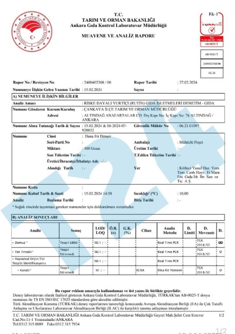 27 Şubat ve 7 Mart tarihlerinde sonuçlanan iki farklı muayene ve analiz raporunda, numune olarak alınan dana eti döneri ve tüketime hazır pişmiş köftede domuz etine rastlandı. Yapılan incelemelerde, tek tırnaklı ya da kanatlı hayvan eti ise tespit edilemedi.