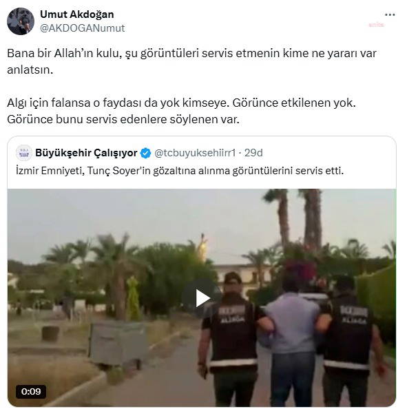 "Bana bir Allah’ın kulu, şu görüntüleri servis etmenin kime ne yararı var anlatsın. Algı için falansa o faydası da yok kimseye. Görünce etkilenen yok. Görünce bunu servis edenlere söylenen var."