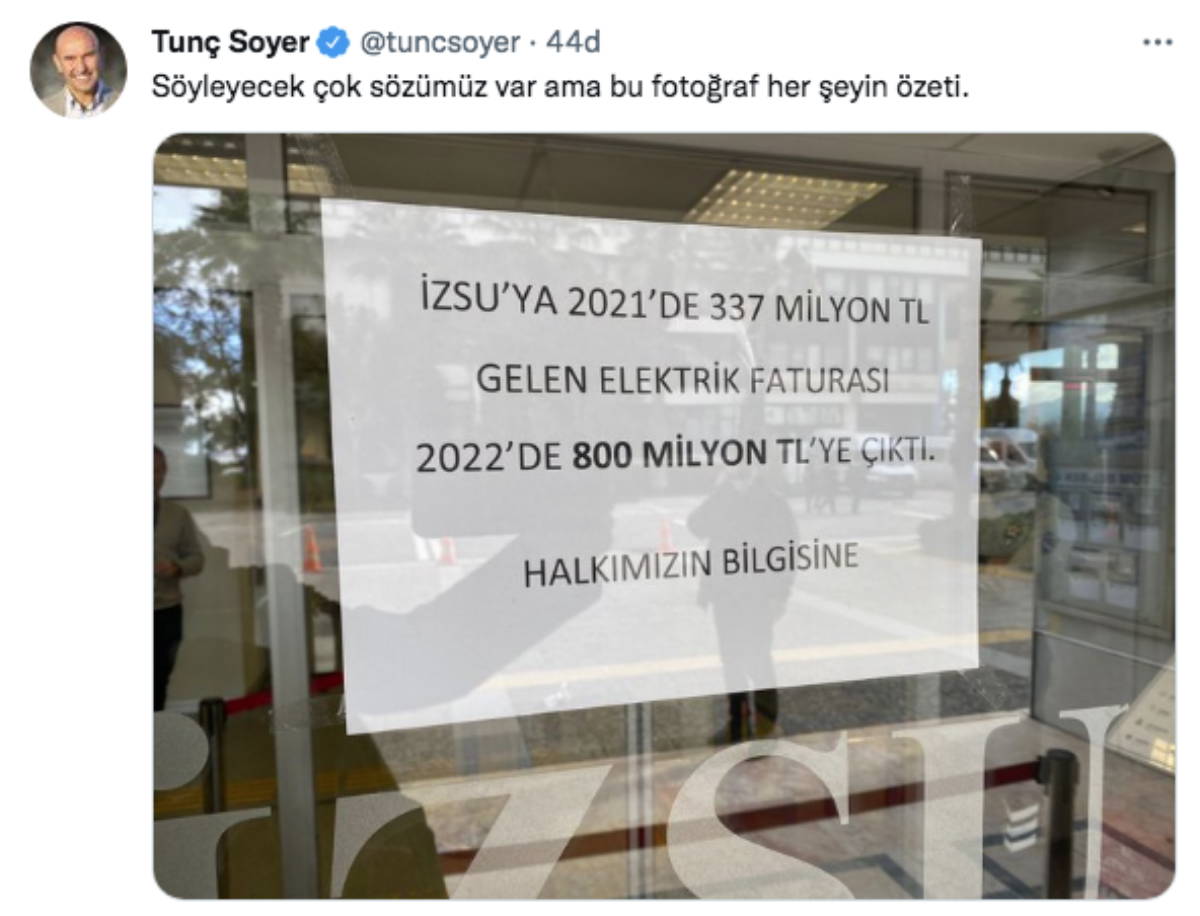 İzmir Büyükşehir Belediyesi'nin iştiraki İzmir Su ve Kanalizasyon İdaresi Genel Müdürlüğü (İZSU) de gelen elektrik faturasını camına asarak, "İZSU’ya 2021’de 337 milyon TL gelen elektrik faturası 2022’de 800 milyon TL’ye çıktı. Halkımızın bilgisine" ifadelerine yer verdi.