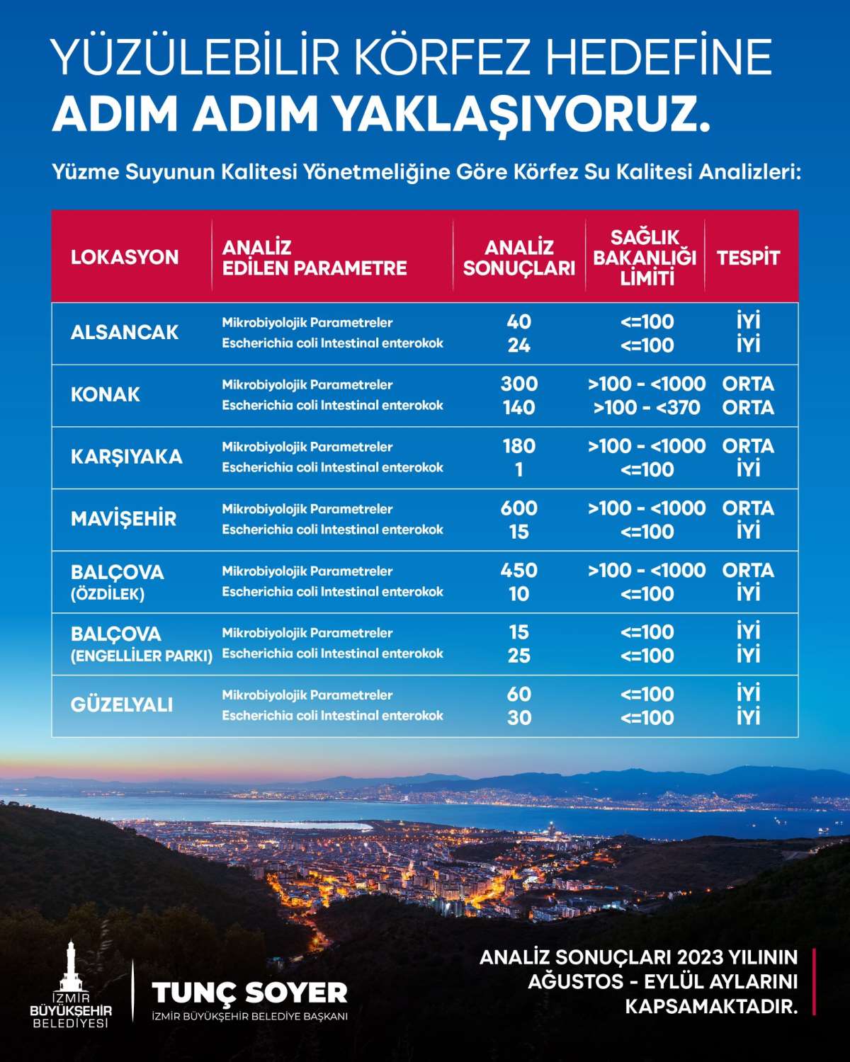 Soyer, sosyal medya hesabından “Kamuoyuna duyurulur” notuyla paylaştığı görselde "Yüzülebilir Körfez hedefine adım adım yaklaşıyoruz. Yüzme suyunun kalitesi yönetmeliğine göre; körfez su kalitesi analizleri” yer aldı.