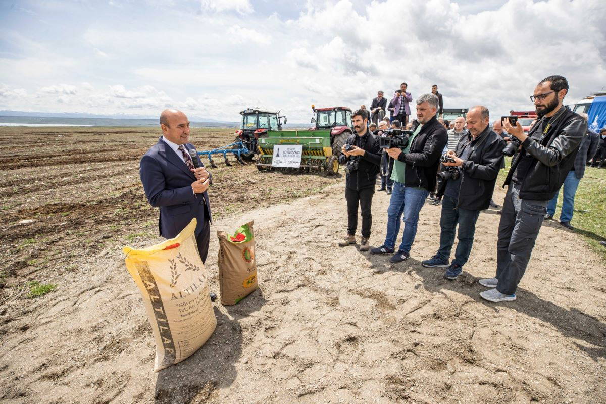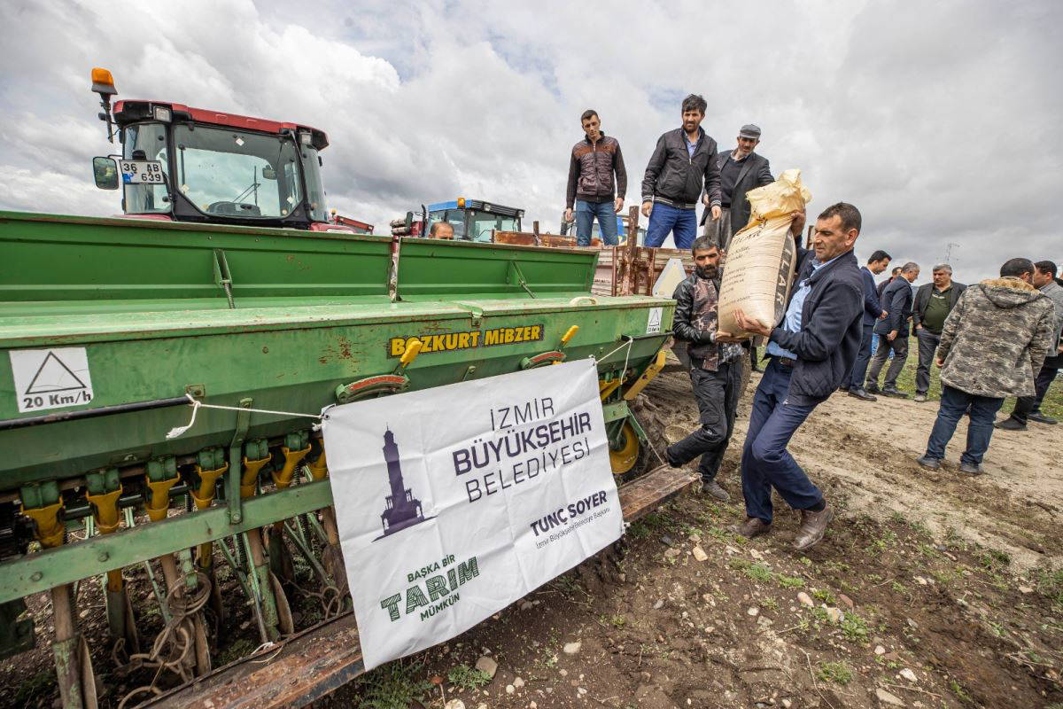 Dağıtımın ardından ekim yapılacak tarlaya gidildi. Burada konuşan İzmir Büyükşehir Belediye Başkanı Tunç Soyer, “Yaptığımız şey bugün biraz daha bayrama ve kutlamaya dönüştü. Gerçekten Anadolu öyle bir coğrafya ki biz İzmir’de hasada hazırlanıyoruz burada ekime geldik. Bir tarafta hasat bir tarafta ekim yapılabilen olağanüstü bir coğrafyada yaşıyoruz. Ve bu yoksulluk bu kuraklık hiçbirimizin hak etmediği bir tablo. Emin olun ki bu bir kader değil. Çünkü bu bereketli toprakların bereketini birileri hortumlasın diye onlara aktardılar. Buradaki küçük üreticiyi yoksullaştırdılar. Bu bir politik, siyasi bir tercihti. Bu tercihin sonuçlarını yaşıyoruz bugün Anadolu’da. Karşılaştığımız yoksulluk, kuraklık tamamen yanlış tarım politikalarının sonucudur, bir kader değildir. Onun için 'başka bir tarım mümkün' diyoruz. Bu bereketli toprakların b ereketiyle karnını doyuran, yüzlerce yıldır atasından devraldığı topraklarda huzurlu yaşamını devam ettiren, sağlıklı, güle oynaya hayatını devam ettiren köylümüz, üreticimiz artık üretimden vazgeçme noktasına, hayvanını kesme noktasına gelmiştir. Biz buğday ve arpa tohumu getirirken aslında buraya umudu yeşertmeye geldik buraya. Çünkü biliyoruz ki bu mümkün. El ele verirsek başarırız. Bu yanlış tarım politikalarını değiştirip küçük üreticiden, köylüden yana uygulama yaparsanız işte bu mümkün. Ne demiş Mustafa Kemal Atatürk? Köylü milletin efendisidir. Neden demiş? Çünkü bilmiş ki eğer kendi kendine yeten bir ekonomi yaratabilirse bir memleket dışarıya muhtaç olmaz ve o zaman kalkınmanın, büyümenin önü açılır. Ne yaptık köylümüzü? Tunuslu, Faslı, Kanadalı üreticinin önünde e zdirdik. Mercimeği Kanada’dan sıfır vergiyle ithal ediyoruz. Sen niye buradaki üreticinin vergisini sıfırlamıyorsun? Bu nasıl bir kafa, nasıl bir tercih? Bunların hepsi değişecek. Bunların hepsini değiştirmeye muktediriz. 'Başka bir tarım mümkün'. Yine bu topraklarda kadim kültürün evlatları olarak güler yüzle, sağlıkla, huzurla yaşayacağımız günleri hep beraber kuracağız” açıklamasını yaptı.