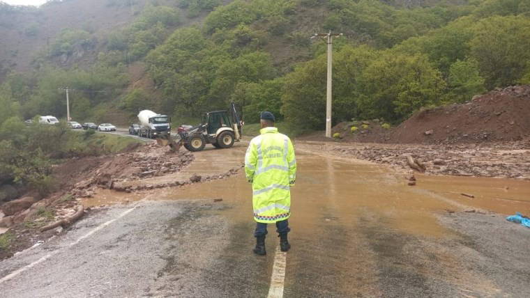Öğle saatlerinde yoğun yağış sonrası Tunceli-Erzincan karayolunun 63. kilometresinde heyelan meydana geldi.