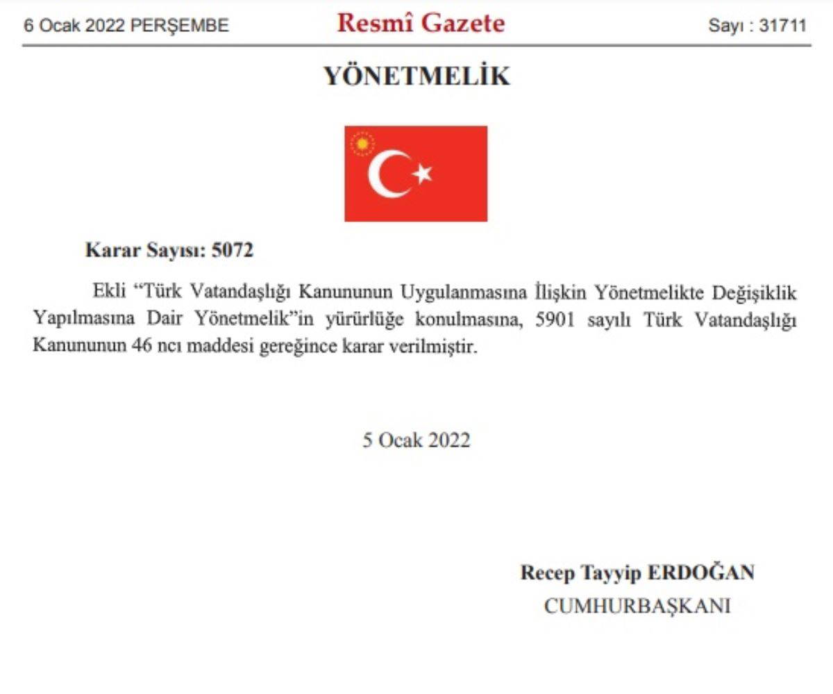 Resmi Gazete'nin bugünkü sayısında Cumhurbaşkanı Recep Tayyip Erdoğan'ın imzası ile yayımlanan, 'Türk Vatandaşlığı Kanunun Uygulanmasına İlişkin Yönetmelikte Değişiklik Yapılmasına Dair Yönetmelik'e göre; yabancı uyruklu kişilerin Türk vatandaşlığına kabulündeki şartlarda değişikliğe gidildi.