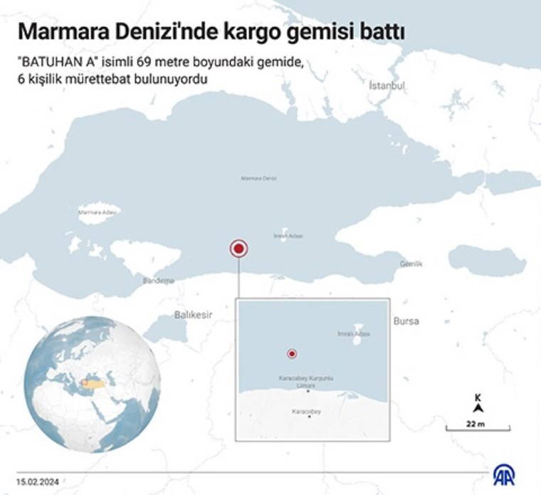Sabah saatlerinde Marmara Denizi'nin İmralı Adası yakınlarında 6 kişilik mürettebatı bulunan "BATUHAN A" adlı kuru yük gemisi su alarak battı. İçişleri Bakanı Ali Yerlikaya bölgeye çok sayıda kurtarma ekibinin yönlendirildiğini söylerken çalışmaların yoğun şekilde devam ettiği belirtildi.