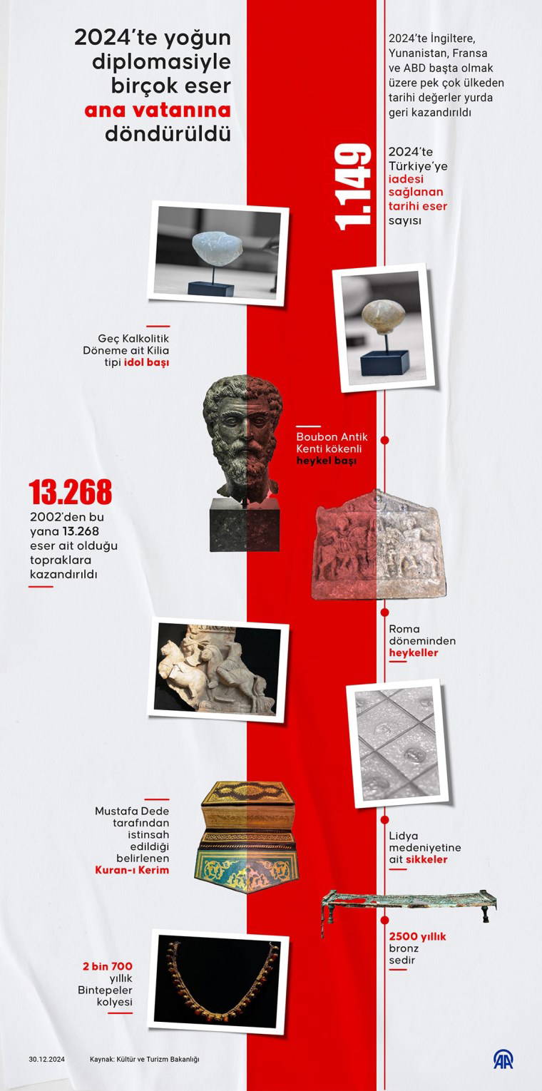 AA muhabirinin 2024'te iadesi sağlanan eserlerden derlediği bilgilere göre, yılın yurda dönen son eserleri, Yunanistan'da kaçakçıların elinden kurtarılan ve Türkiye'ye ait olduğu tespit edilen Lidya medeniyetine ait 1055 sikke oldu.