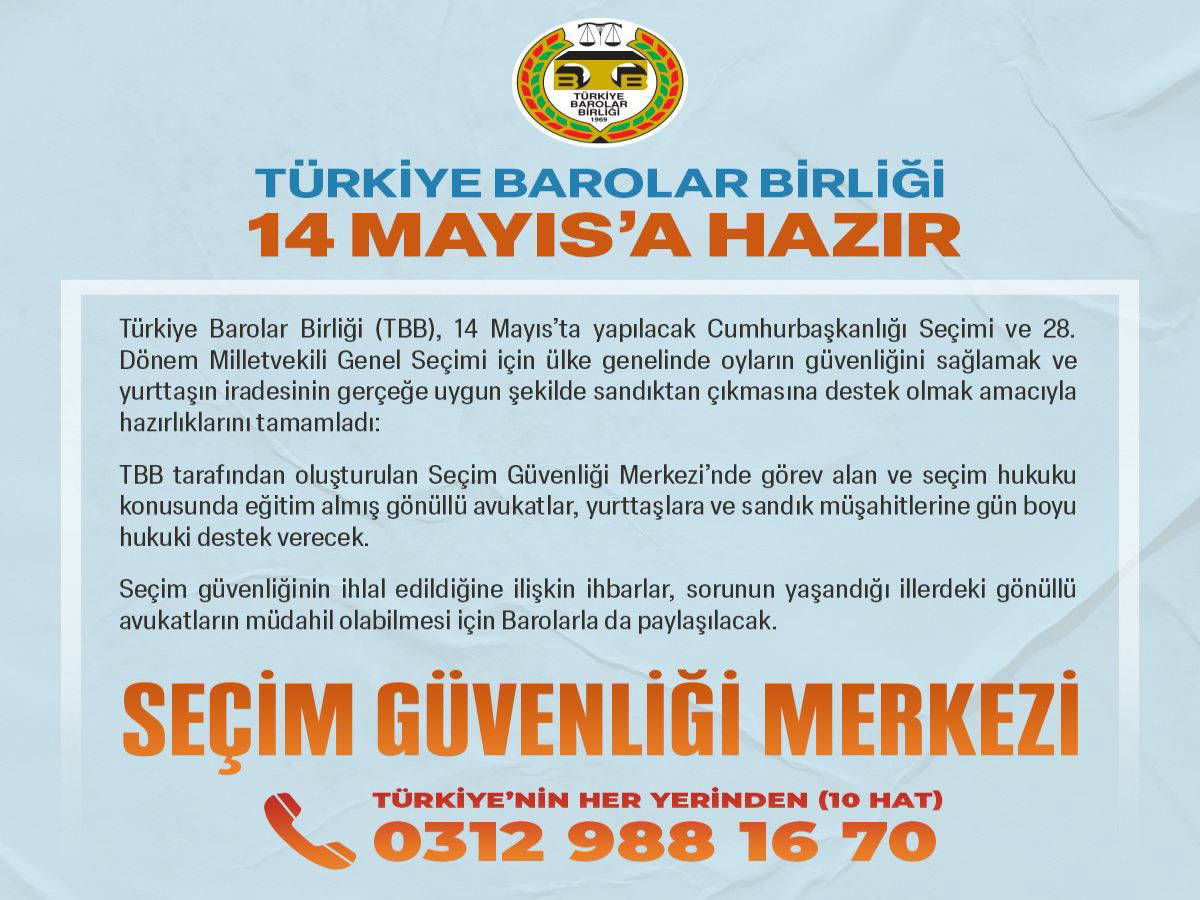 Türkiye Barolar Birliği (TBB) seçim ihlalleri karşı ‘Seçim Güvenliği Merkezi’ oluşturdu. Yurttaşlar, paylaşılan numarayı arayıp hukuki destek alabilecek.