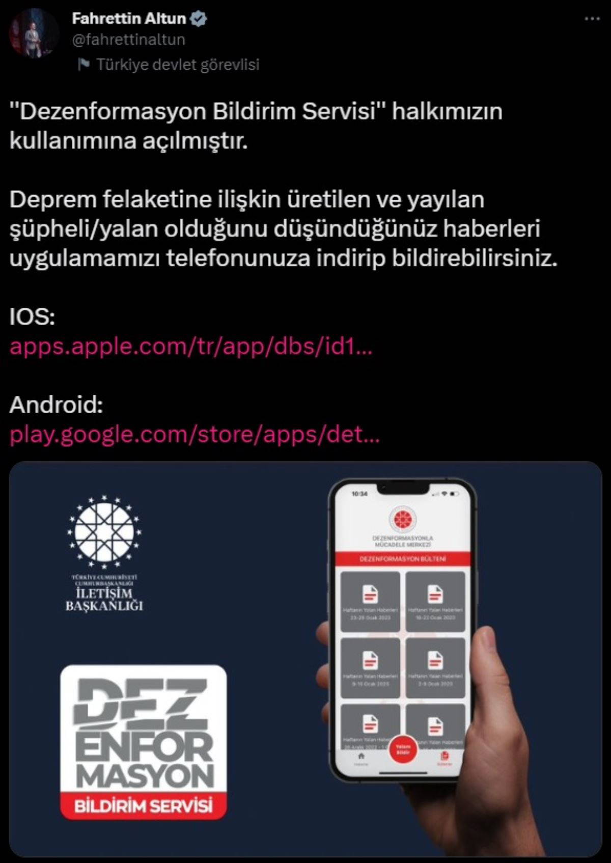Altun, sosyal medya hesabından yaptığı açıklamada, "Dezenformasyon Bildirim Servisi halkımızın kullanımına açılmıştır. Deprem felaketine ilişkin üretilen ve yayılan şüpheli/yalan olduğunu düşündüğünüz haberleri uygulamamızı telefonunuza indirip bildirebilirsiniz" ifadelerini kullandı.