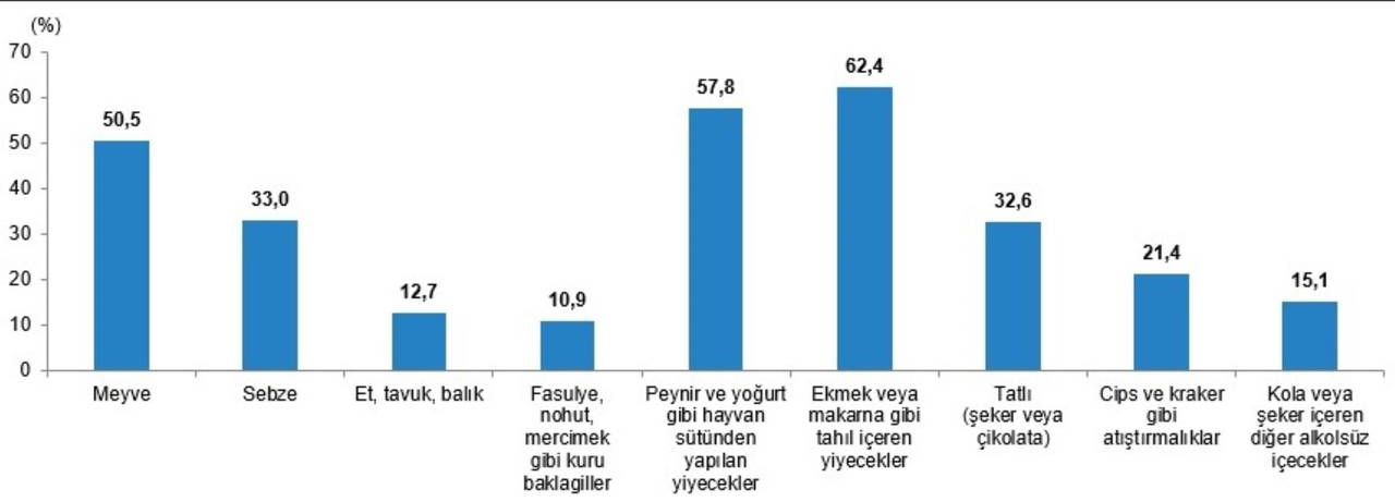 Meyveyi her gün tükettiği belirtilen çocukların oranı yüzde 50,5, sebzeyi her gün tükettiği ifade edilen çocukların oranı yüzde 33, olurken; et, tavuk veya balığı her gün tükettiği aktarılan çocukların oranı ise yüzde 12,7 ile sınırlı kaldı.