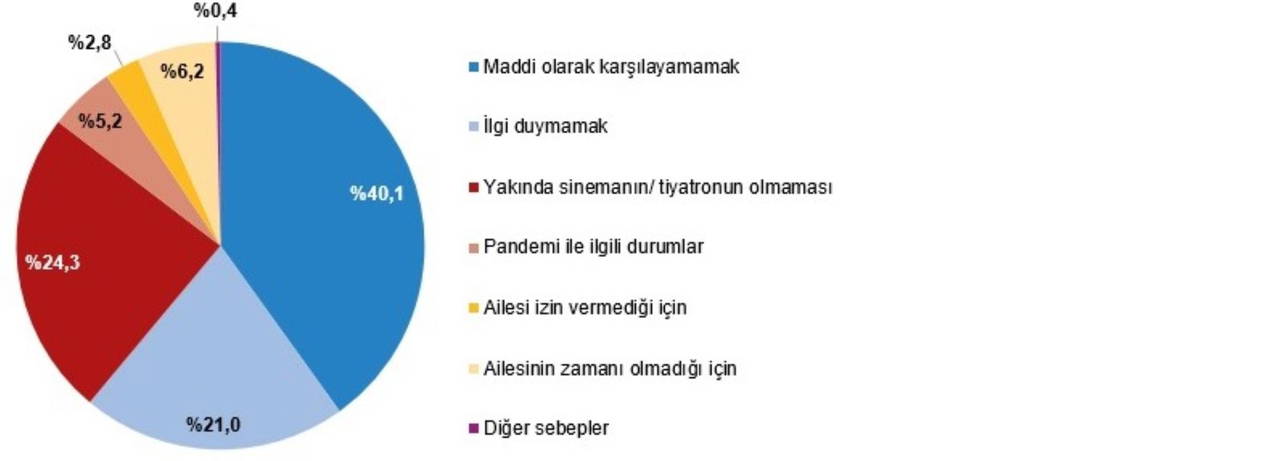 Anneleri/temel bakım verenleri tarafından son 12 ayda sinema ve/veya tiyatroya gitmediği belirtilen 6-17 yaş grubundaki çocukların %40,1'inin aileleri tarafından maddi olarak bu etkinliğin karşılanamadığı, %24,3'ünün yaşadığı yerin yakınında sinemanın/tiyatronun olmadığı, %21,0'ının sinema veya tiyatroya ilgi duymadığı, %6,2'sinin ailesinin zamanı olmadığı için götürmediği, %5,2'sinin pandemi ile ilgili durumlar nedeniyle, %2,8'inin ailesinin izin vermediği için gidemediği görüldü.