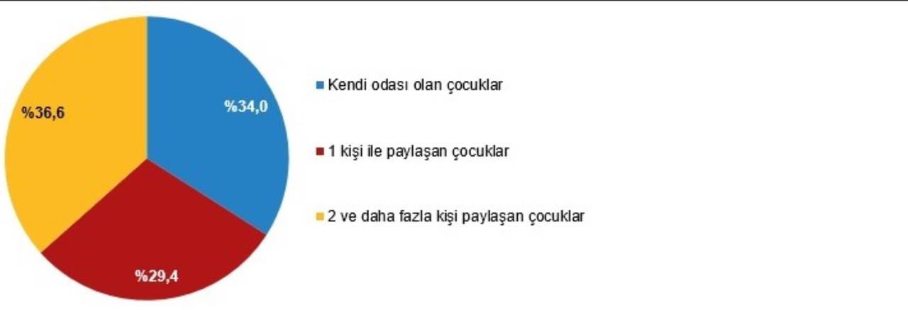 Kendine ait odası olan çocukların oranı %34,0 iken kendine ait odası olmayan çocuklar arasında, uyumak için kullandığı odayı bir hanehalkı üyesi ile paylaşanların oranı %29,4, iki veya daha fazla hanehalkı üyesi ile paylaşanların oranı ise %36,6 oldu.