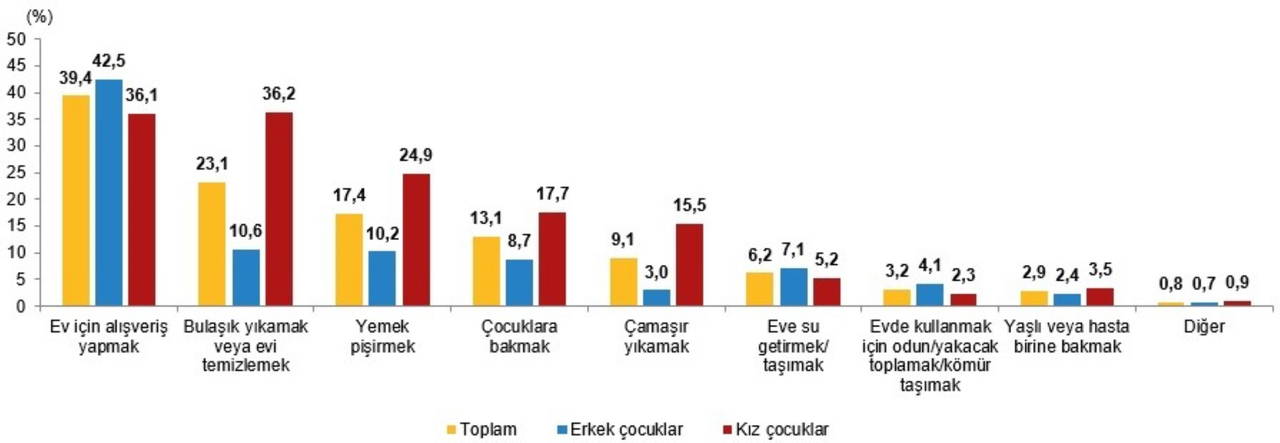 Anneleri/temel bakım verenleri tarafından son bir hafta içerisinde ev için alışveriş yaptığı belirtilen 5-17 yaş grubundaki çocukların oranının %39,4, bulaşık yıkayan veya ev temizleyenlerin oranının %23,1, yemek pişirenlerin oranının %17,4, evdeki diğer çocuklara bakanların oranının %13,1, çamaşır yıkayanların oranının ise %9,1 olduğu görüldü.