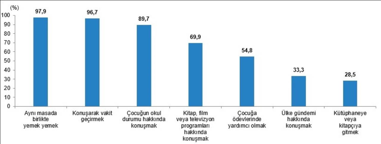 Anneleri/temel bakım verenleri tarafından ebeveynleri ile birlikte ayda en az bir kez okul durumları hakkında konuştukları belirtilen 6-17 yaş grubundaki çocukların oranı yüzde 89,7, kitap, film veya televizyon programları hakkında konuştukları belirtilen çocukların oranı yüzde 69,9, kütüphaneye veya kitapçıya gittiği belirtilen çocukların oranı ise yüzde 28,5 oldu.