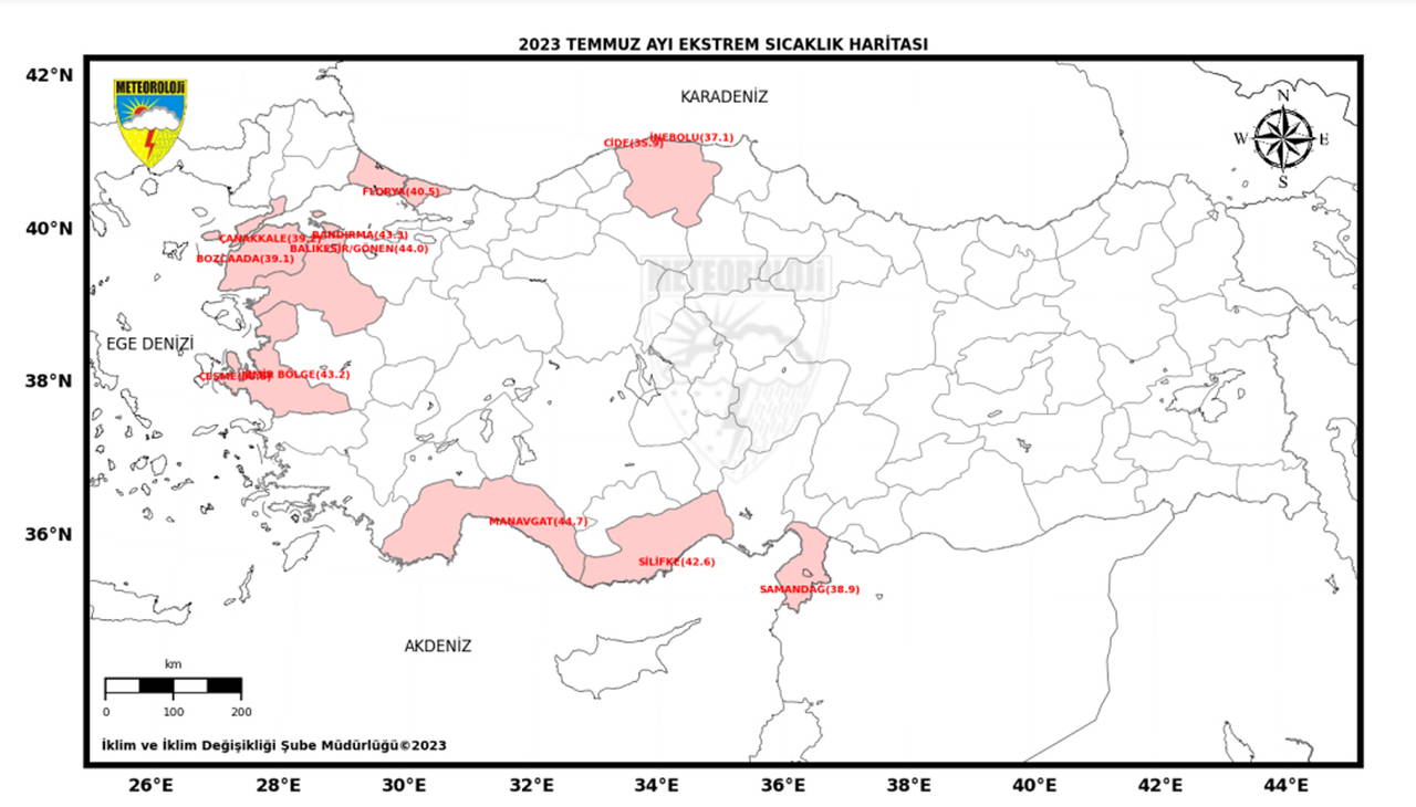 Maksimum sıcaklıklar ise güney ve batı kıyı bölgelerinde 45-48 derecelik sıcaklık bandına ulaştı. 2023 yılı temmuz ayı ortalama maksimum sıcaklıkları, 1991-2020 maksimum normalinin 1,7 derece üzerinde gerçekleşti.