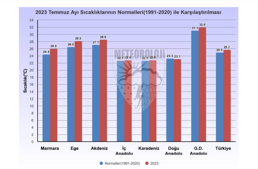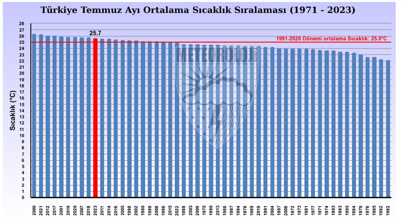 Meteoroloji Genel Müdürlüğü'nün 2023 yılı, temmuz ayına ilişkin hazırladığı 'Sıcaklık ve Yağış Değerlendirmesi Raporu'na göre; 1991-2020 uzun yıllar ortalama sıcaklığı 25 derece olan temmuz ayında, 2023 yılı temmuz ayı ortalama sıcaklığı 25,7 dereceye yükseldi.