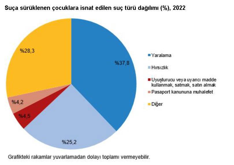 Güvenlik birimine gelen veya getirilen çocukların karıştığı olayların 206 bin 853'ü suça sürüklenme nedeni ile gerçekleşti. Bu çocukların yüzde 37,8'ine yaralama, yüzde 25,2'sine hırsızlık, yüzde 4,5'ine uyuşturucu veya uyarıcı madde kullanmak, satmak veya satın almak, yüzde 4,2'sine pasaport kanununa muhalefet suçu, yüzde 4,1'ine ise tehdit suçları isnat edildi.