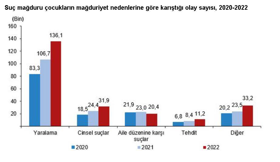 Güvenlik birimlerine suç mağduru olarak gelen veya getirilen 232 bin 739 çocuğun yüzde 58,5'i yaralama, yüzde 13,7'si cinsel suçlar, yüzde 8,7'si aile düzenine karşı suçlar, yüzde 4,8'i tehdit, yüzde 14,3'ü bu nedenlerin dışında kalan diğer nedenlerden dolayı mağdur oldu.