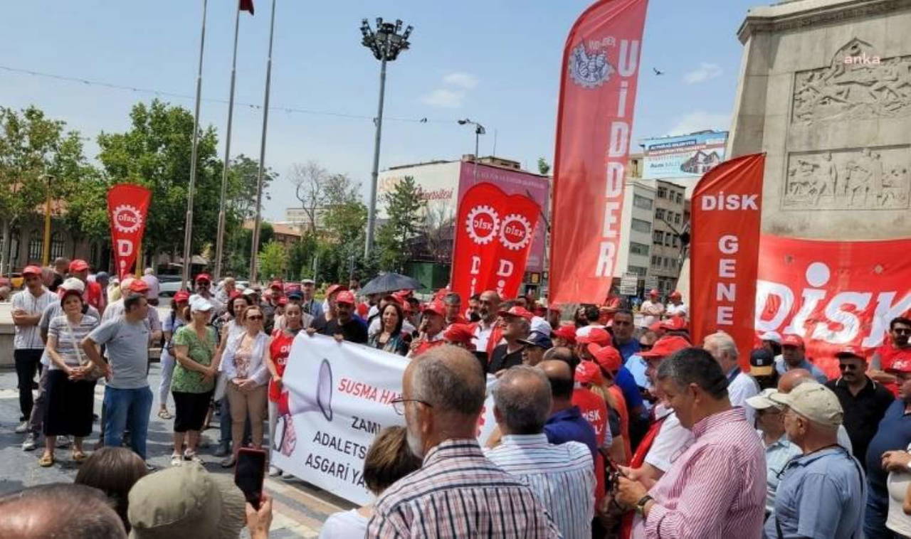 DİSK üyeleri, bugün Ankara Ulus Meydanı’nda zamları ve vergileri protesto etti. DİSK İç Anadolu Bölgesi Temsilcisi Tayfun Görgün, “Bu zamlarla, bu vergilerle geçinemiyoruz. Enflasyonun sıfıra düştüğünü ilan edenlerin masallarına karnımız tok. Çarşıda, pazarda, markette, faturalarda karşı karşıya kaldığımız gerçeği biz biliyoruz. Düşük gösterilen TÜİK enflasyonu yüzünden alım gücümüzü kaybediyoruz” diye konuştu. DİSK Emekli Sen Genel Sekreteri Fikri Kalender, “9 milyon emekli açlık sınırının altında yaşıyor. 9 milyon emekliyi ölüme mahkum ettiler” dedi.