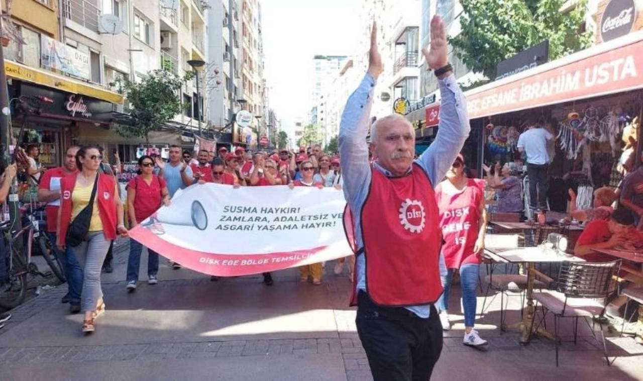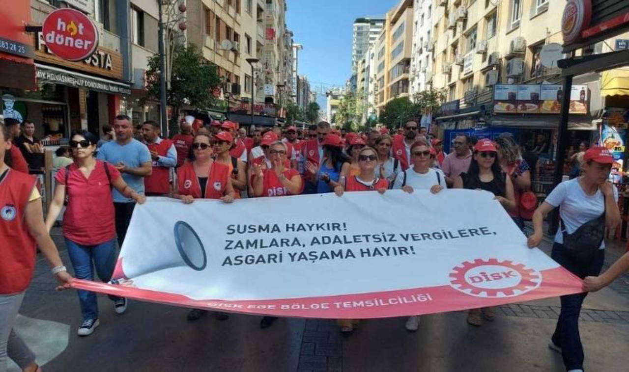 Türkiye Devrimci İşçi Sendikaları Konfederasyonu’na (DİSK) bağlı sendikaların üyeleri İzmir’de art arda gelen zamları ve vergileri protesto etti. Genel grev çağrısı yapan DİSK Ege Bölge Temsilcisi Memiş Sarı, “TÜRK-İş’e, Hak-İş’e, memur sendikalarına çağrı yapıyoruz; biz genel grevi, genel direnişi örgütlemeye hazır mıyız? Kendilerine sendika diyenlere çağrımız; genel grev, genel direniş” dedi.