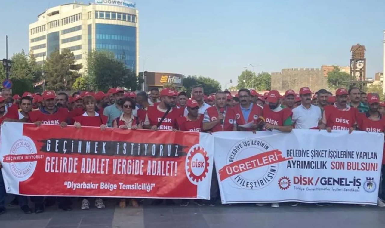 DİSK Genel İş Sendikası Diyarbakır şubeleri, zamlara ve hayat pahalılığına karşı ek protokol talebi ile Diyarbakır Dağkapı meydanında basın açıklaması gerçekleştirdi. "Geçinmek istiyoruz, gelirde adalet, vergide adalet" ve "Belediye şirket işçilerine yapılan ayrımcılık son bulsun" pankartı ardında toplanan kitle adına açıklamayı Becet Barut okudu.