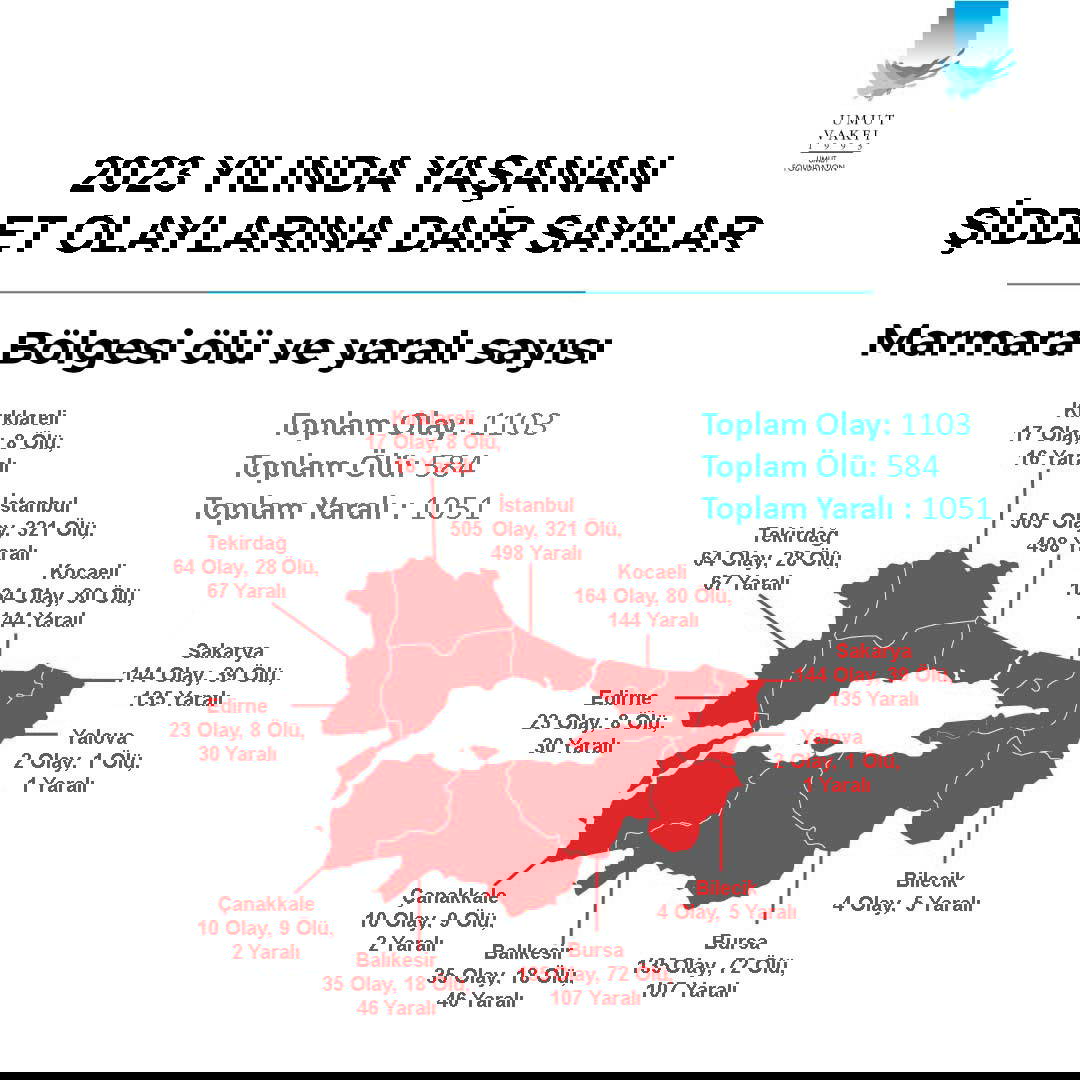2023 yılında yaşanan silahlı şiddete bölgeler bazında bakıldığında; nüfus yoğunluğunun yaşandığı Marmara Bölgesi’ndeki 11 ilde yaşanan ve basına yansıyan toplam bin 103 olayda, 584 kişi öldürüldü, bin 51 kişi de yaralandı. İstanbul 505 olayla en çok olayın yaşandığı kent oldu. Basına yansıyan bu 505 şiddet olayında 321 kişi öldü, 498 kişi de yaralandı. İstanbul’u 80 kişinin öldüğü, 144 kişinin yaralandığı 164 olayla sanayi kenti Kocaeli, 144 olayla Sakarya, 135 olayla Bursa izliyor.