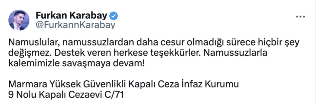 "Namuslular, namussuzlardan daha cesur olmadığı sürece hiçbir şey değişmez. Destek veren herkese teşekkürler. Namussuzlarla kalemimizle savaşmaya devam!