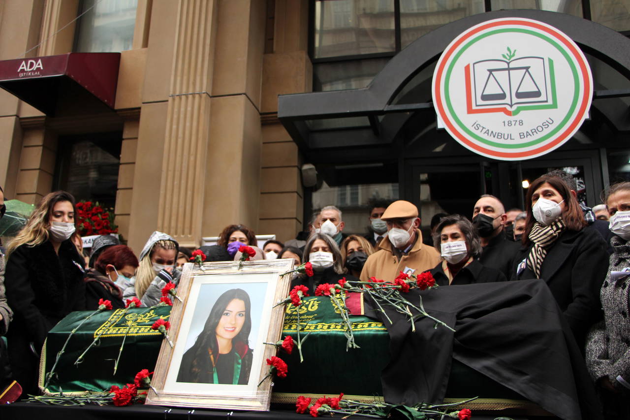 Dilara Yıldız'ın cenazesi saat 12.00'da İstiklal Caddesi'ndeki baro binası önüne getirildi. Törene Dilara Yıldız'ın annesi Elvan Yıldız, kız kardeşi Merve Yıldız, İstanbul Baro Başkanı Mehmet Durakoğlu ve meslektaşları katıldı.