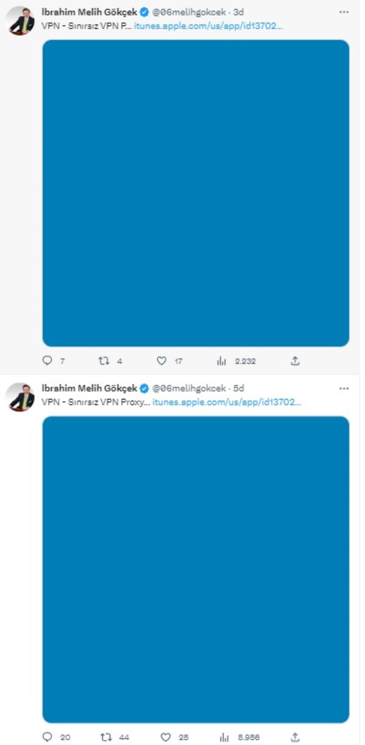 Ankara Büyükşehir Belediyesi'nin görevden alınan eski Belediye Başkanı AKP'li Melih Gökçek, erişim sıkıntısı yaşanan Twitter hesabından VPN paylaşımında bulundu. Gökçek, paylaşımını bir süre sonra sildi.