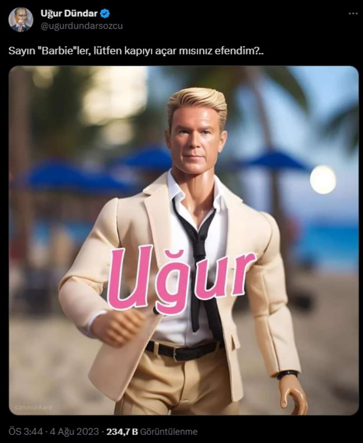 Twitter hesabından yapay zeka ile kendisini Barbie'nin sevgilisi Ken olarak gösterdiği bir paylaşımda bulunan Dündar, "Sayın 'Barbie'ler, lütfen kapıyı açar mısınız efendim?.." notunu düştü.