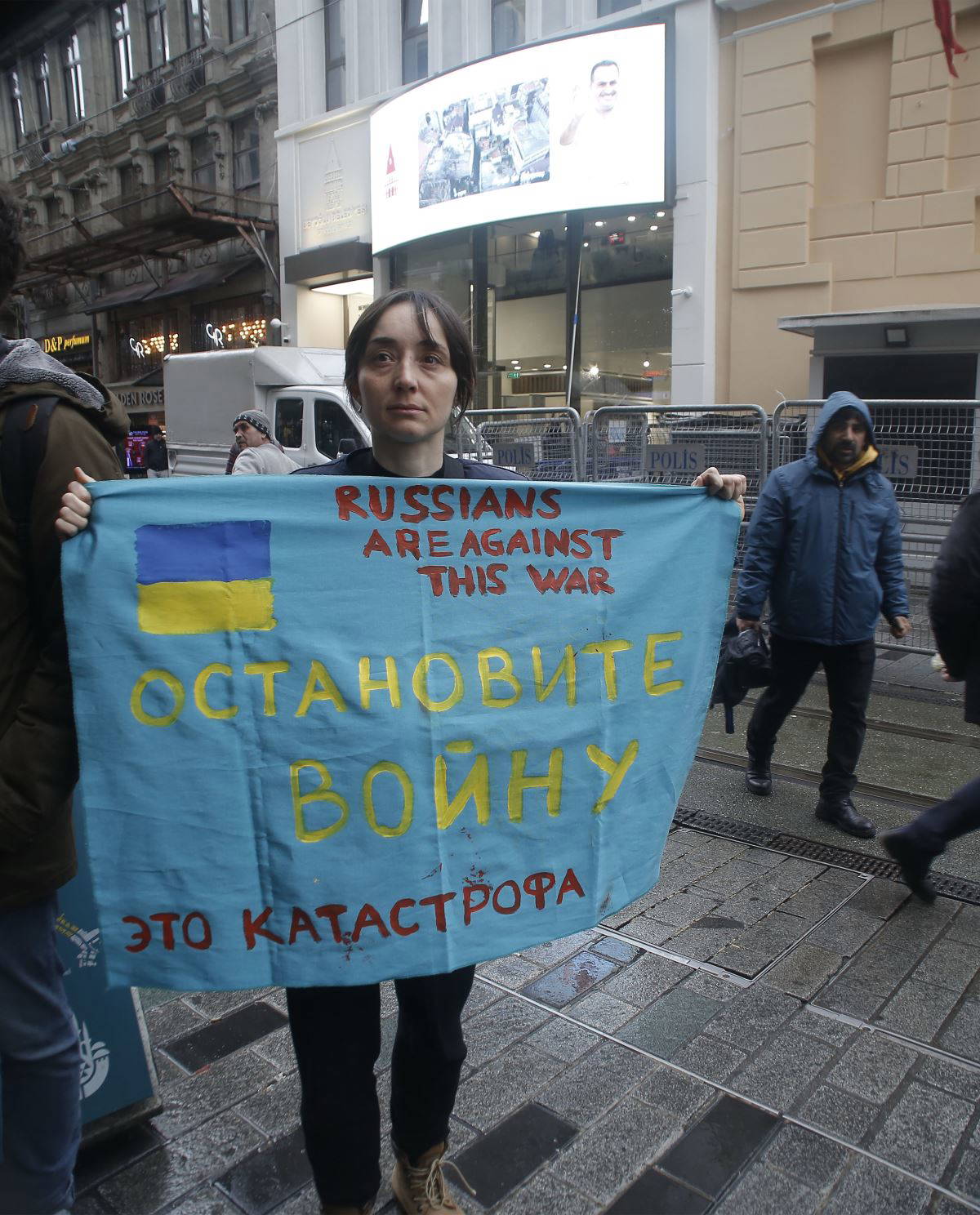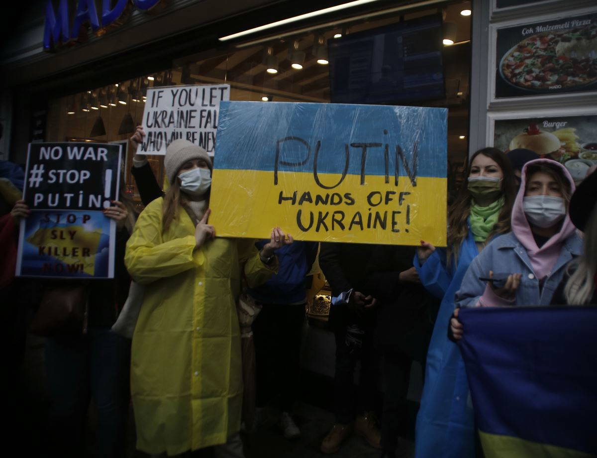 Ellerinde Ukrayna, Kırım ve Türk bayrakları bulunan protestocu grup Rusya Devlet Başkanı Vladimir Putin ve savaş aleyhine sloganlar attı. Üzerinde savaş karşıtı yazı bulunan dövizler taşıyan eylemcilerden bazılarının gözyaşlarına hakim olamadığı görüldü.