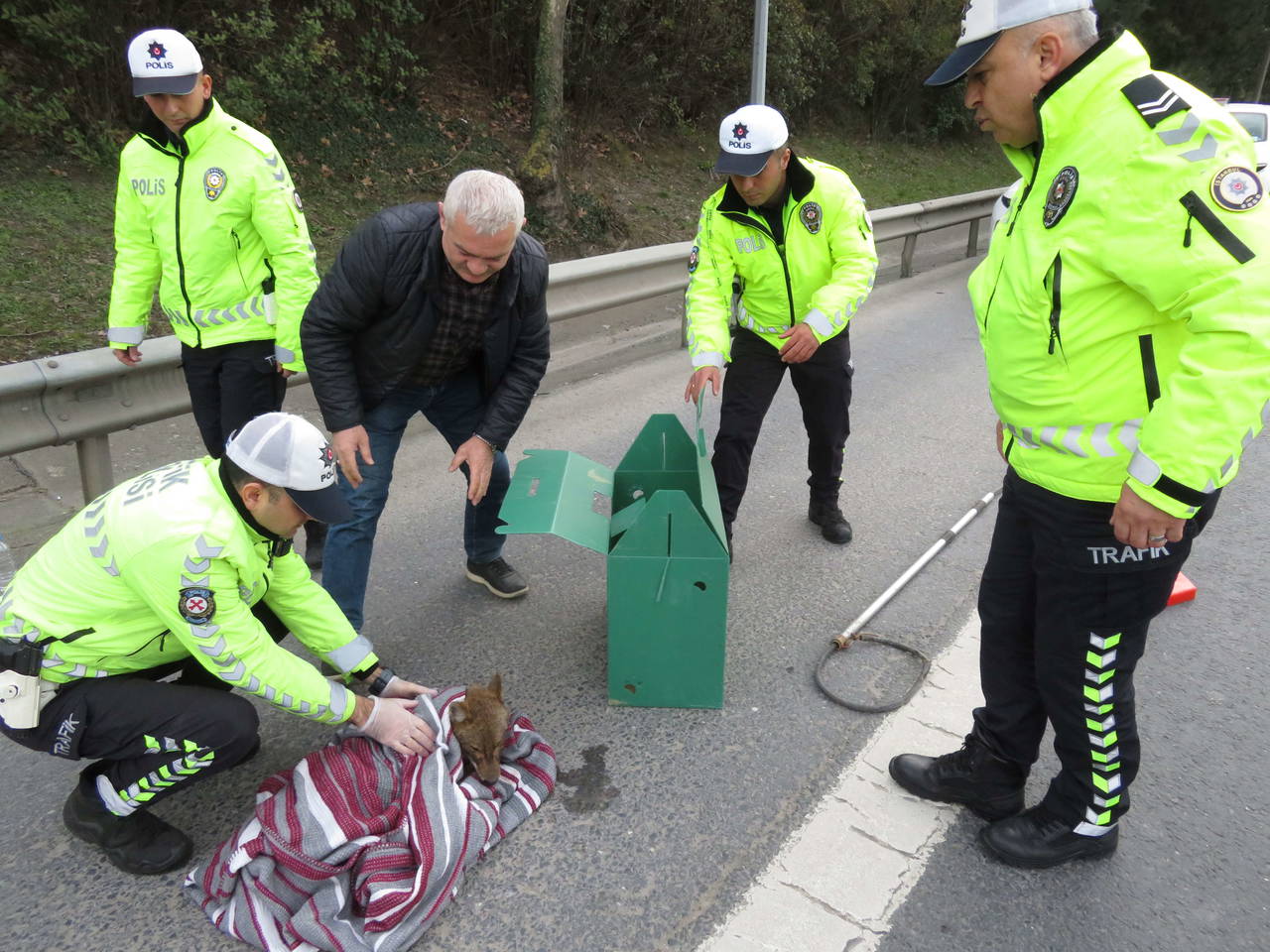 İhbar üzerine olay yerine giden Trafik Denetleme Şube Müdürlüğüne bağlı ekipler, çakal olduğu anlaşılan yaralı hayvanı yakalayarak emniyet şeridine getirdi.