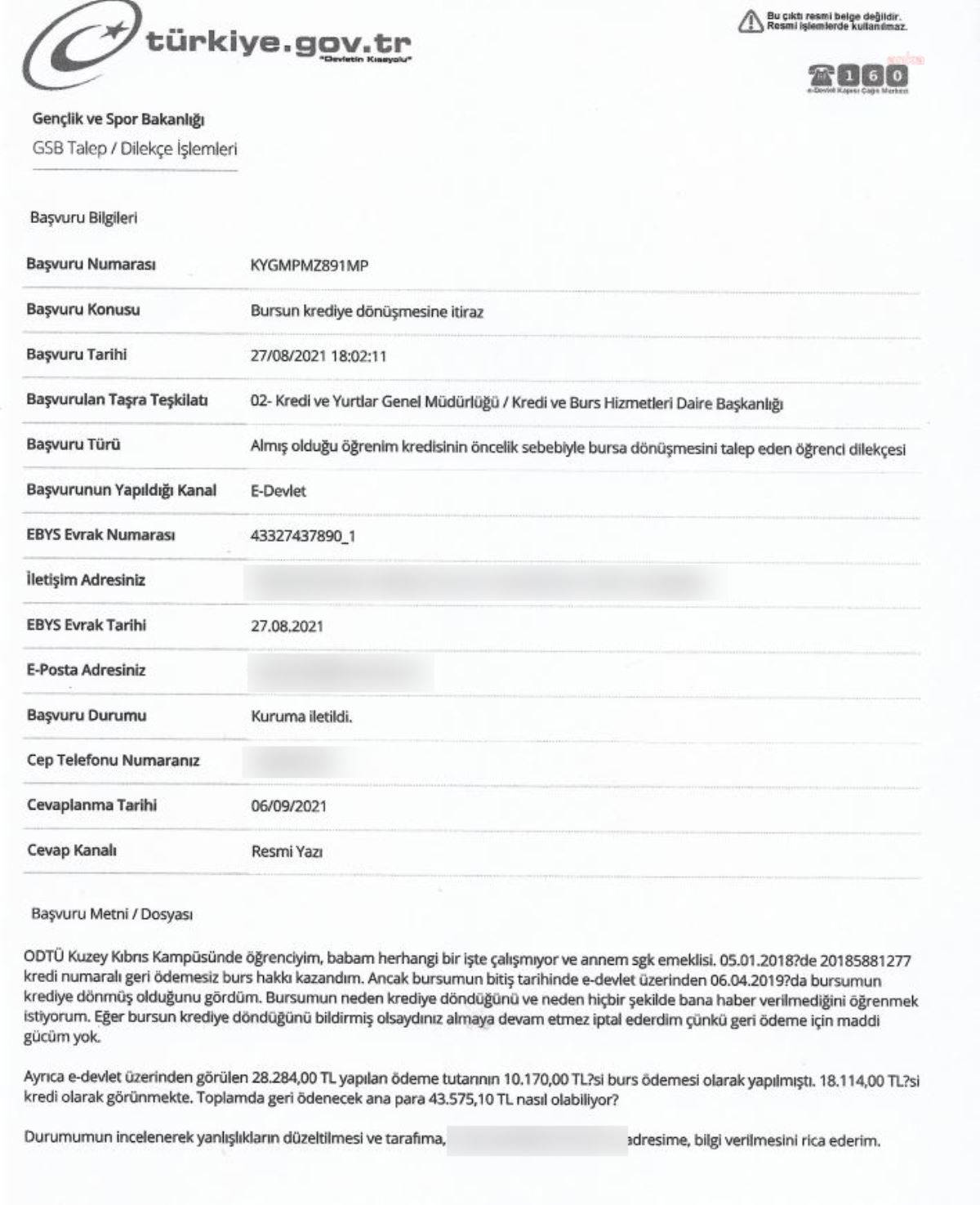 Kredi ve Yurtlar Genel Müdürlüğü'nden ise 6 Eylül 2021'de dilekçeye şu yanıt geldi: