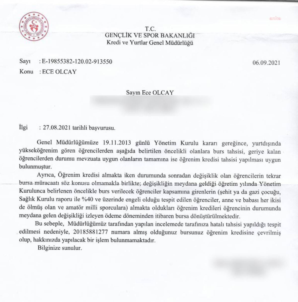 Ece Olcay, kendisine haber verilmeden yapılan değişiklik nedeniyle Cumhurbaşkanlığı İletişim Merkezi'ne (CİMER) başvurup, Kredi ve Yurtlar Genel Müdürlüğü'ne de dilekçe yazdı.