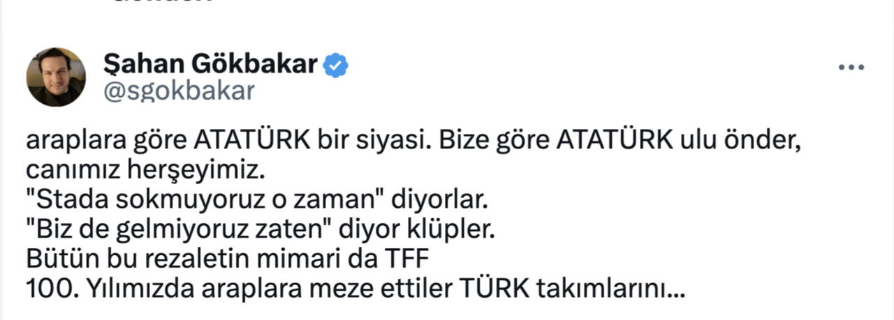 Oyuncu Şahan Gökbakar, "Araplara göre ATATÜRK bir siyasi. Bize göre ATATÜRK ulu önder, canımız herşeyimiz. "Stada sokmuyoruz o zaman" diyorlar. "Biz de gelmiyoruz zaten" diyor kulüpler. Bütün bu rezaletin mimari da TFF. 100. Yılımızda araplara meze ettiler TÜRK takımlarını..." ifadelerini kullandı.