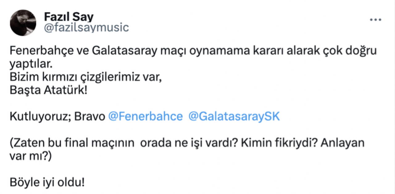 Dünyaca ünlü piyanist Fazıl Say, "Fenerbahçe ve Galatasaray maçı oynamama kararı alarak çok doğru yaptılar. Bizim kırmızı çizgilerimiz var, Başta Atatürk! Kutluyoruz; Bravo @Fenerbahce @GalatasaraySK