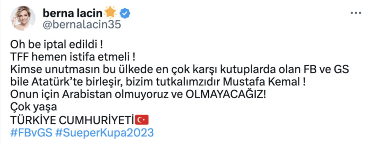Oyuncu Berna Laçin, "Oh be iptal edildi ! TFF hemen istifa etmeli ! Kimse unutmasın bu ülkede en çok karşı kutuplarda olan FB ve GS bile Atatürk’te birleşir, bizim tutkalımzıdır Mustafa Kemal ! Onun için Arabistan olmuyoruz ve OLMAYACAĞIZ! Çok yaşa TÜRKİYE CUMHURİYETİ" paylaşımında bulundu.