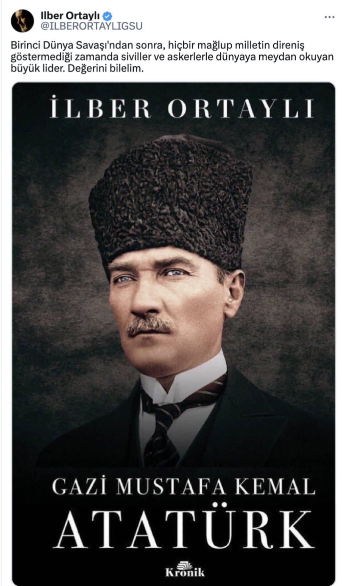 Tarihçi İlbey Ortaylı, "Birinci Dünya Savaşı'ndan sonra, hiçbir mağlup milletin direniş göstermediği zamanda siviller ve askerlerle dünyaya meydan okuyan büyük lider. Değerini bilelim" paylaşımı yaptı.