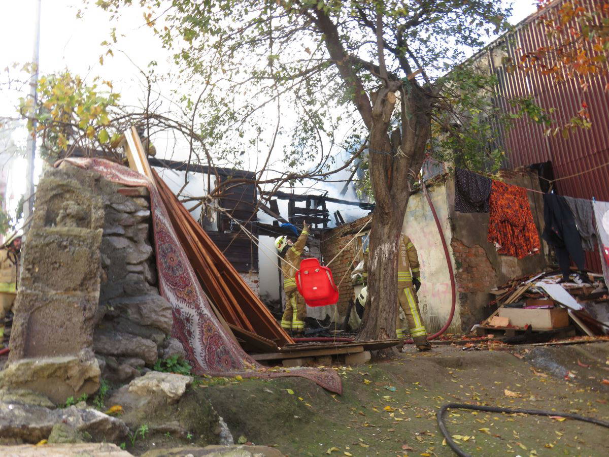 İtfaiye ekiplerinin müdahalesiyle yaklaşık bir saatte kontrol altına alınan yangın nedeniyle ahşap bina çöktü.
