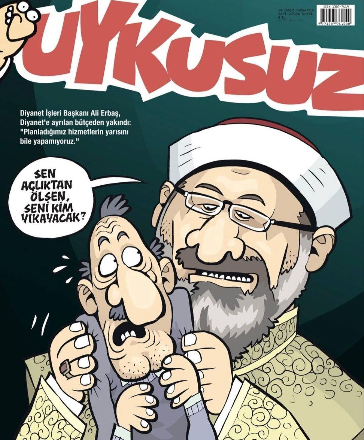 Haftalık mizah ve karikatür dergisi Uykusuz, bu hafta Diyanet İşleri Başkanı Ali Erbaş'ın 'bütçe' açıklamasını kapağına taşıdı.