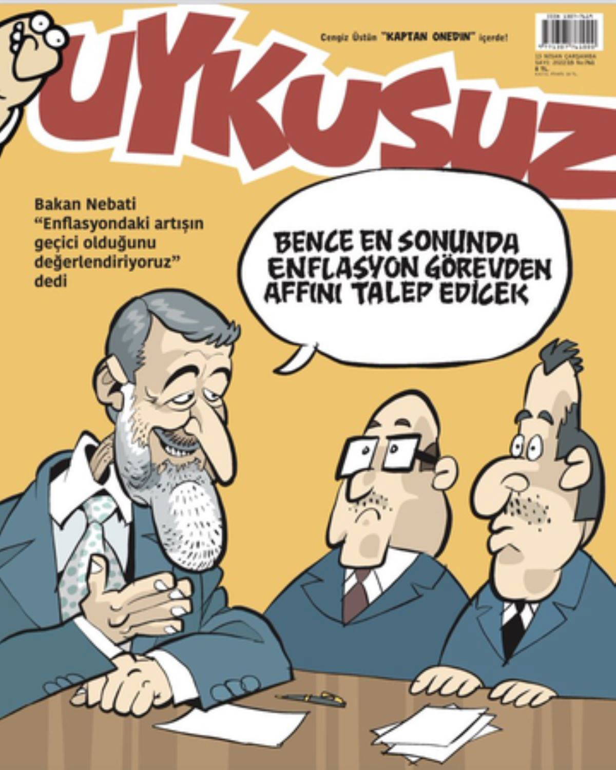Bakan Nebati'nin "Enflasyondaki artışın geçici olduğunu değerlendiriyoruz' sözlerine atıfta bulunan Uykusuz dergisi, 'Bence en sonunda enflasyon görevden affını talep edecek' ironisiyle dikkat çeken göndermede bulundu.