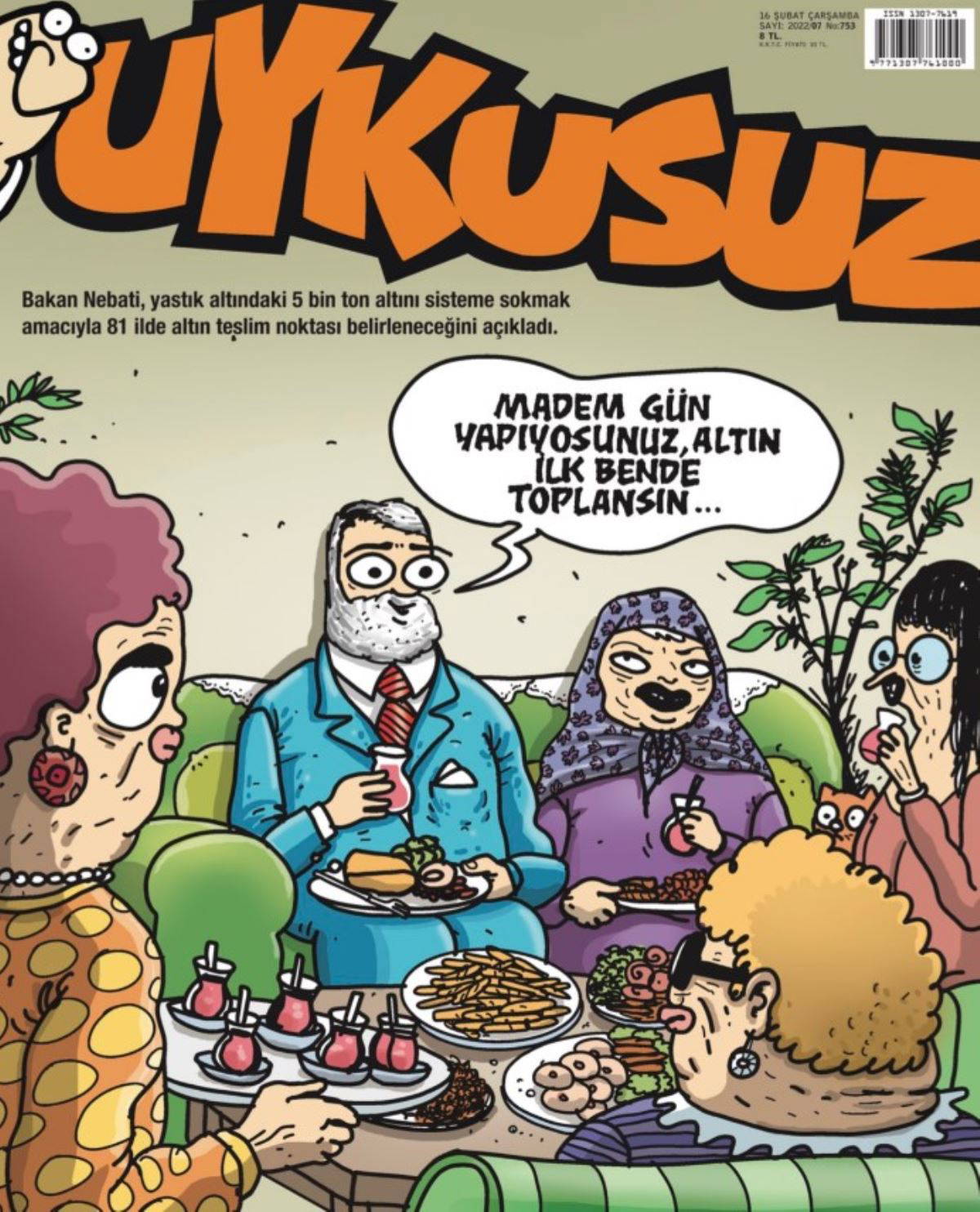Mizah dergisi Uykusuz, vatandaşların ‘yastık altı‘ndaki altınlarını sisteme sokmak için 81 ilde merkezler kurulacağını duyuran Hazine ve Maliye Bakanı Nureddin Nebati’yi kapağına taşıdı. Uykusuz’un kapağında altın gününe katılan Nebati’nin altınları şu şekilde istediği görülüyor: